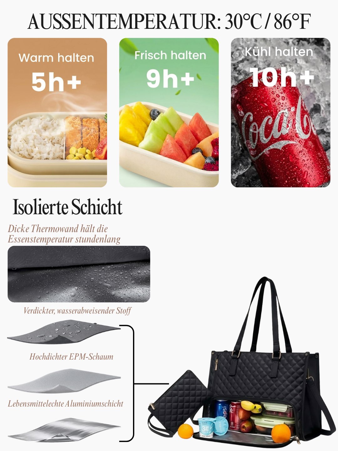 Stell dir vor, du hast deinen kompletten Tag in einer einzigen, eleganten Tasche organisiert. Schluss mit dem Chaos aus separater Lunchbox, Laptoptasche und Handtasche. Das intelligente 3-in-1 Design hält deine Mahlzeiten bis zu 5 Stunden warm oder 10 Stunden kühl. Perfekt organisiert, stilvoll und komfortabel – der ideale Begleiter für Berufstätige, Mütter, Pflegekräfte und Studentinnen.