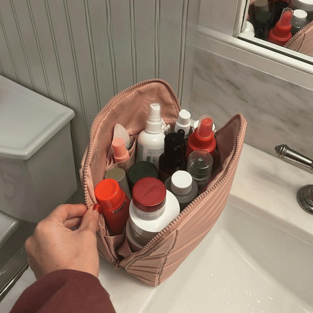 - Stabilitäts-Hack: Öffne den Reißverschluss nur bis zur Hälfte, um eine stabile Box zu erhalten, die perfekt auf jedem Waschtisch steht.